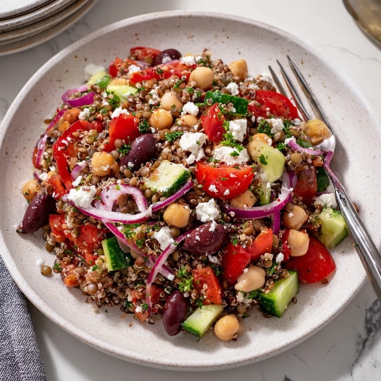 Save My neighbor Eleni once brought this salad to a summer potluck, and I watched everyone go back for seconds before I even got my first serving. She laughed and promised me the recipe, scribbling it on the back of a grocery receipt while we sat on her porch. The next week, I made it for myself and realized why it disappeared so fast: every bite felt like fuel and flavor at once. It became my go-to whenever I wanted something that tasted indulgent but left me feeling light. Now I keep cooked quinoa and lentils in my fridge just so I can throw this together on a whim.