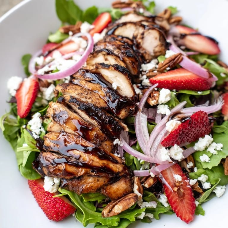 Save My kitchen window was open the first warm evening of spring when I pulled this salad together on a whim. I had strawberries going soft, a lonely chicken breast, and that bottle of balsamic I kept meaning to use for something special. The smell of the glaze reducing on the stove, sweet and sharp at once, drifted outside and my neighbor actually knocked to ask what I was making. That is when I knew this salad was a keeper.