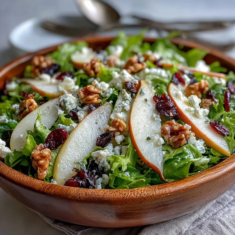 Prepare components separately in advance. Store washed greens, sliced pears with lemon juice, and dressing individually. Assemble just before serving to maintain freshness.