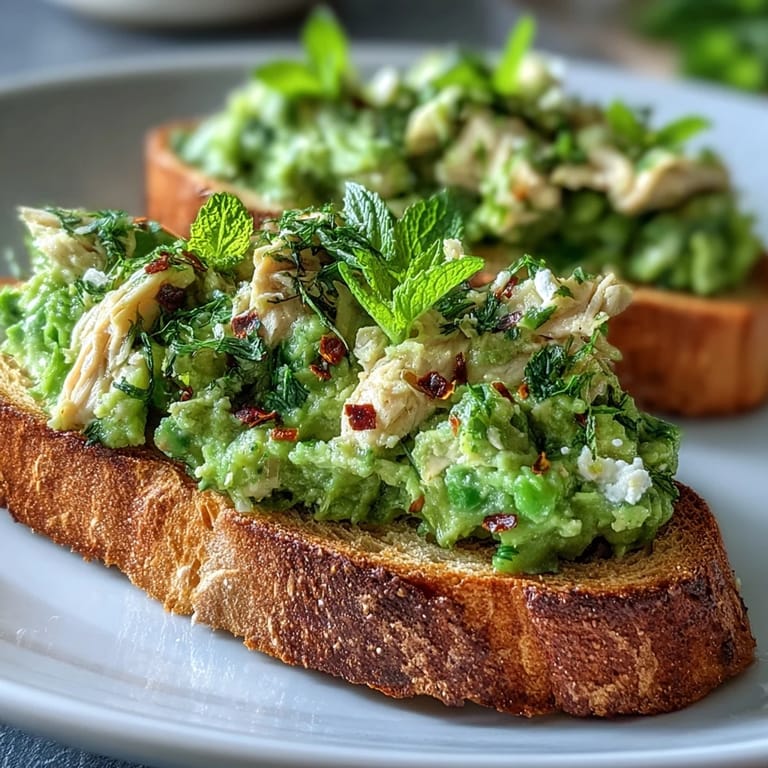 Save Experience a burst of freshness with this Smashed Pea & Chicken Toast. This vibrant, open-faced sandwich combines the sweetness of garden peas with tender shredded chicken, all served on perfectly toasted rustic bread. It is a modern European delight that works beautifully for a nutritious lunch or a light dinner, offering a sophisticated twist on the classic chicken sandwich.